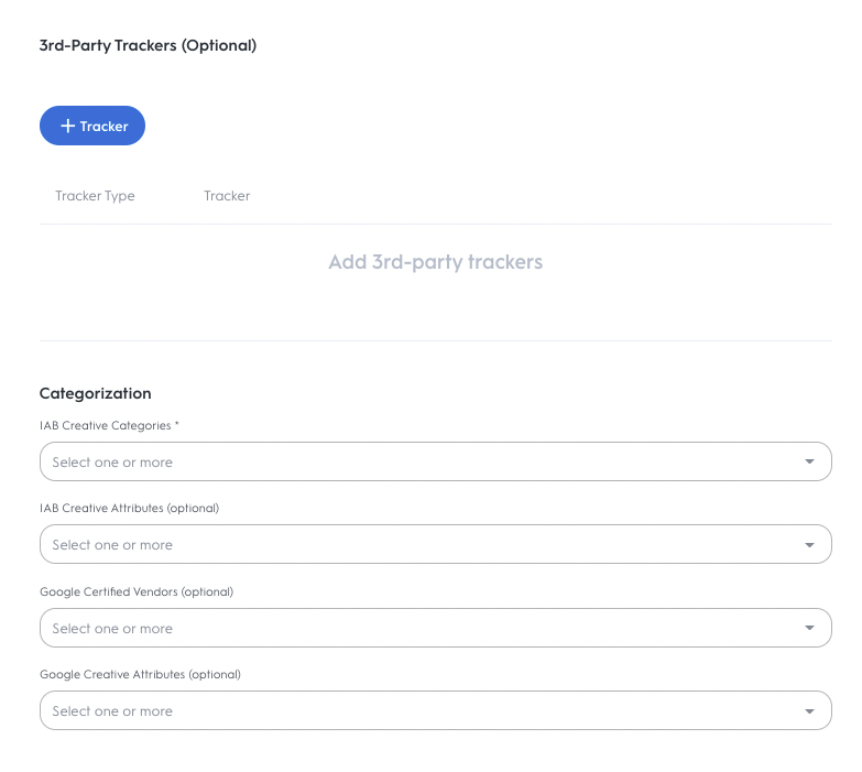 For Image Banner Creatives and Video creatives, click +Tracker to select the tracker type and corresponding URL, code, or input to append the tracker to your ad.