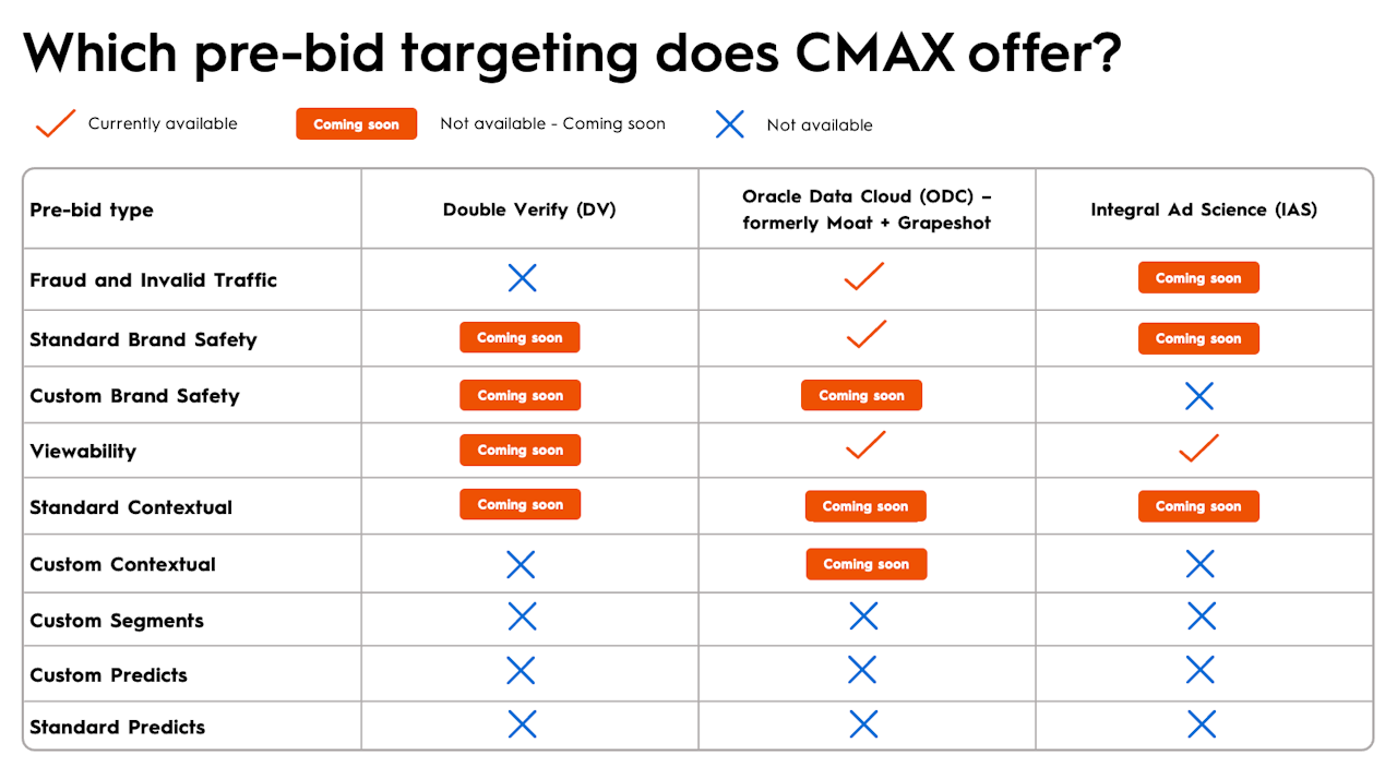 Commerce Max pre-bid targeting ensures that bidding happens only on quality impressions, which helps to save costs and lower block rates. It also helps to protect your brand, avoid invalid traffic and fraud, as well as reduce waste and maximize return.
