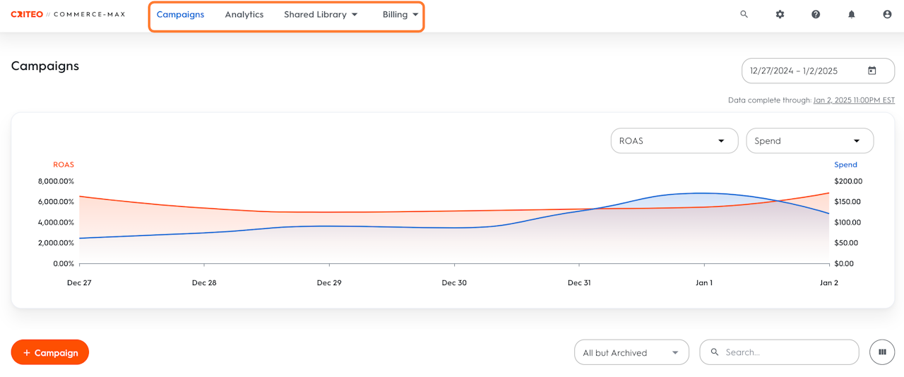 On the top navigation bar, you will find the following tabs - Campaigns, Analytics, Shared Library, and Billing. Clicking any of these section labels will take you to the designated areas within the dashboard.